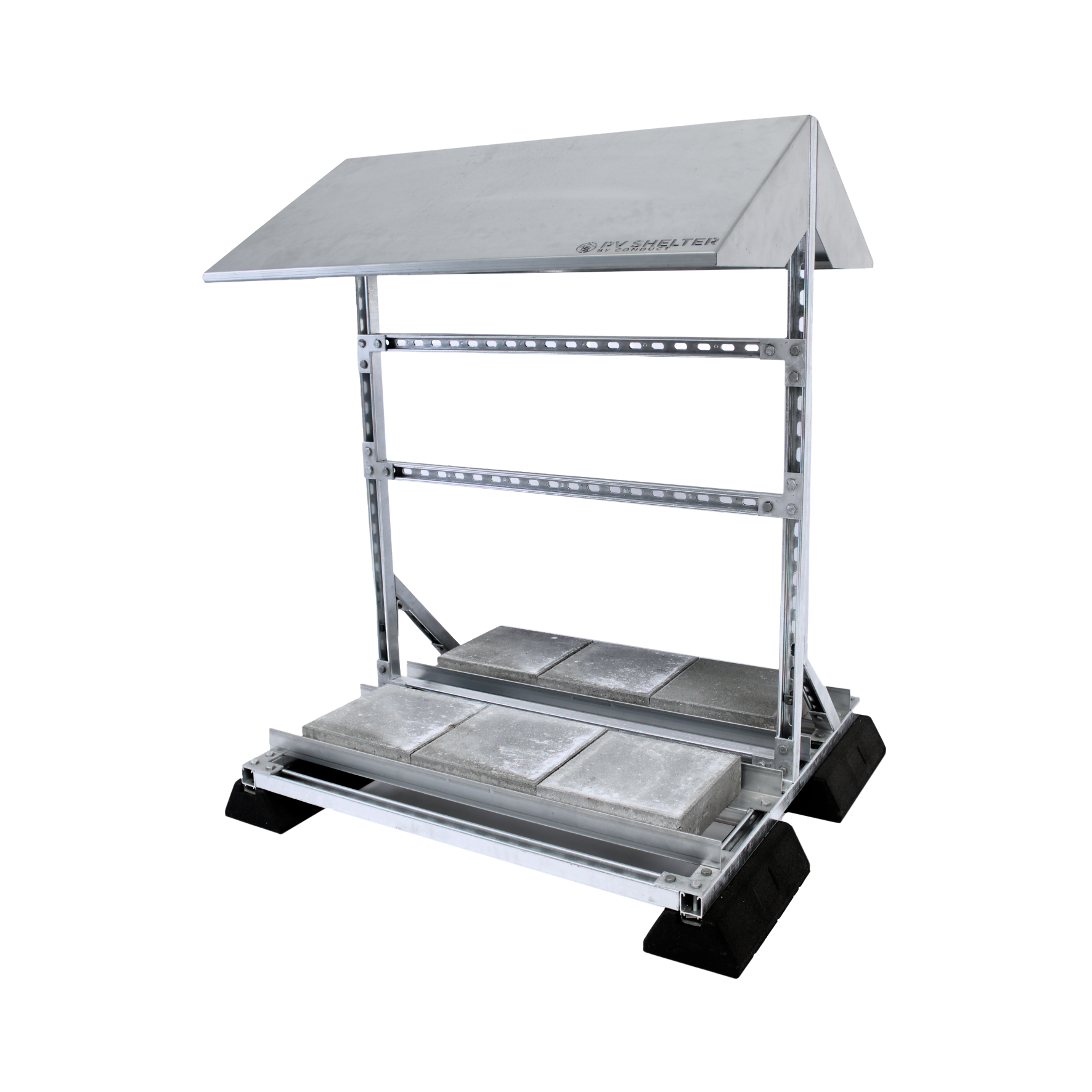 Vrijstaand, 108 cm breed frame voor het plaatsen van omvormers met de ruggen tegen elkaar. De maximale montagebreedte van de omvormers is 200 cm. De PVshelter bestaat uit Magnelis® staal en wordt gemonteerd geleverd, inclusief ballasttegels en montagemateriaal voor de omvormers. Het is windgecertificeerd.